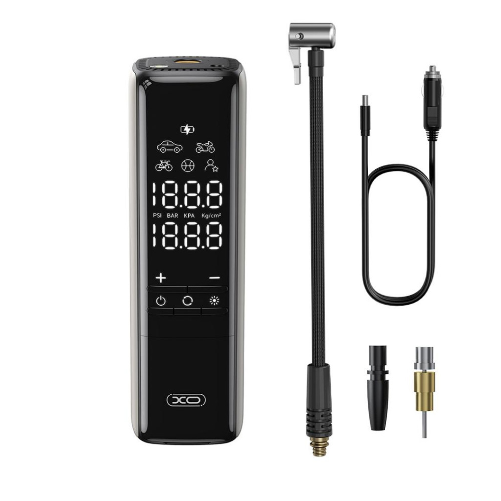 COMPRESOR DE AIRE/INFLADOR XO-CZ017 AUTO/MOTO 12V CON CABLE. Bomba infladora con cable inteligente de 22 cilindros. Con un voltaje de entrada de 12 V DC y una potencia máxima de 120 W, esta bomba proporciona un caudal de aire de 23-25? L/min, asegurando un inflado rápido y sin esfuerzo. – Longitud del cable: 3m – Método de control: botones + pantalla de visualización – Tamaño del tubo de aire: 30 cm – Iluminación LED: 1 luz LED – Peso del producto: 463 g Dimensiones del producto: 17,1 x 5,21 x 5,23 cm.